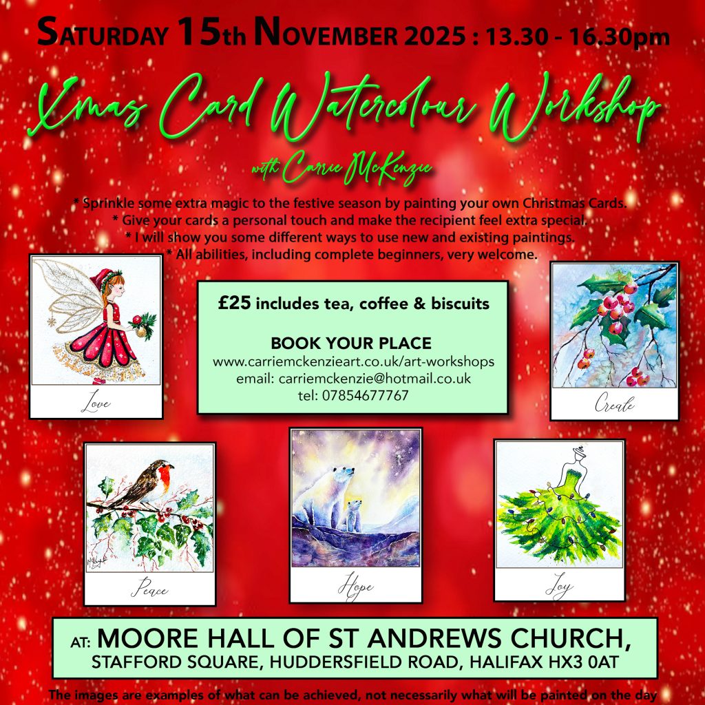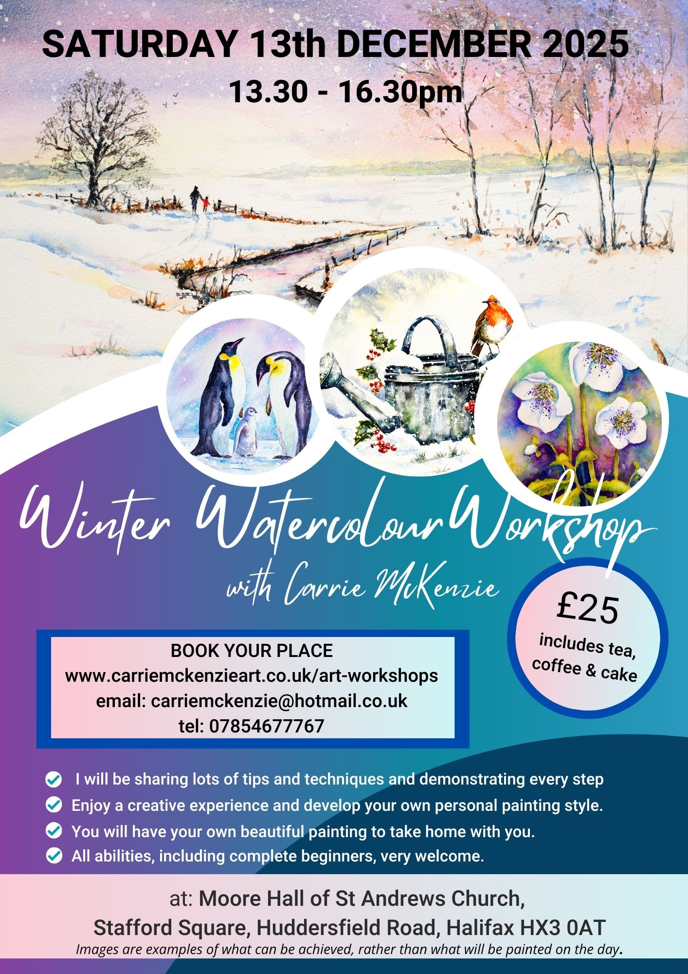 Saturday 13th December 2025: 13:30-16:30 do contact me if you wish to be added to the waiting list Saturday 27th September 2025: 13:30-16:30 £25.00 Saturday 18th October 2025: 13:30-16:30 £25.00 Saturday 23rd August 2025: 13:30-16:30 Saturday 12th July 2025: 13:30-16:30 WATERCOLOUR WORKSHOP Saturday 21st June 2025: 13:30-16:30 WATERCOLOUR WORKSHOP Saturday 24th May 2025: 13:30-16:30 WATERCOLOUR WORKSHOP Saturday 26th April 2025: 13:30-16:30 WATERCOLOUR WORKSHOP Saturday 11th January 2025: 13:30-16:30 WATERCOLOUR WORKSHOP Saturday 8th February 2025: 13:30-16:30 WATERCOLOUR WORKSHOP ART SOCIETY DEMO-WORKSHOPS 2024 If your art club would like me to deliver a mini workshop/demo for your members, please get in touch through the Contact form here on my website ___________________________ ART TUITION BOOKS (see BOOKS tab for ordering) £25.00 ART TUITION FOR 2025 Â