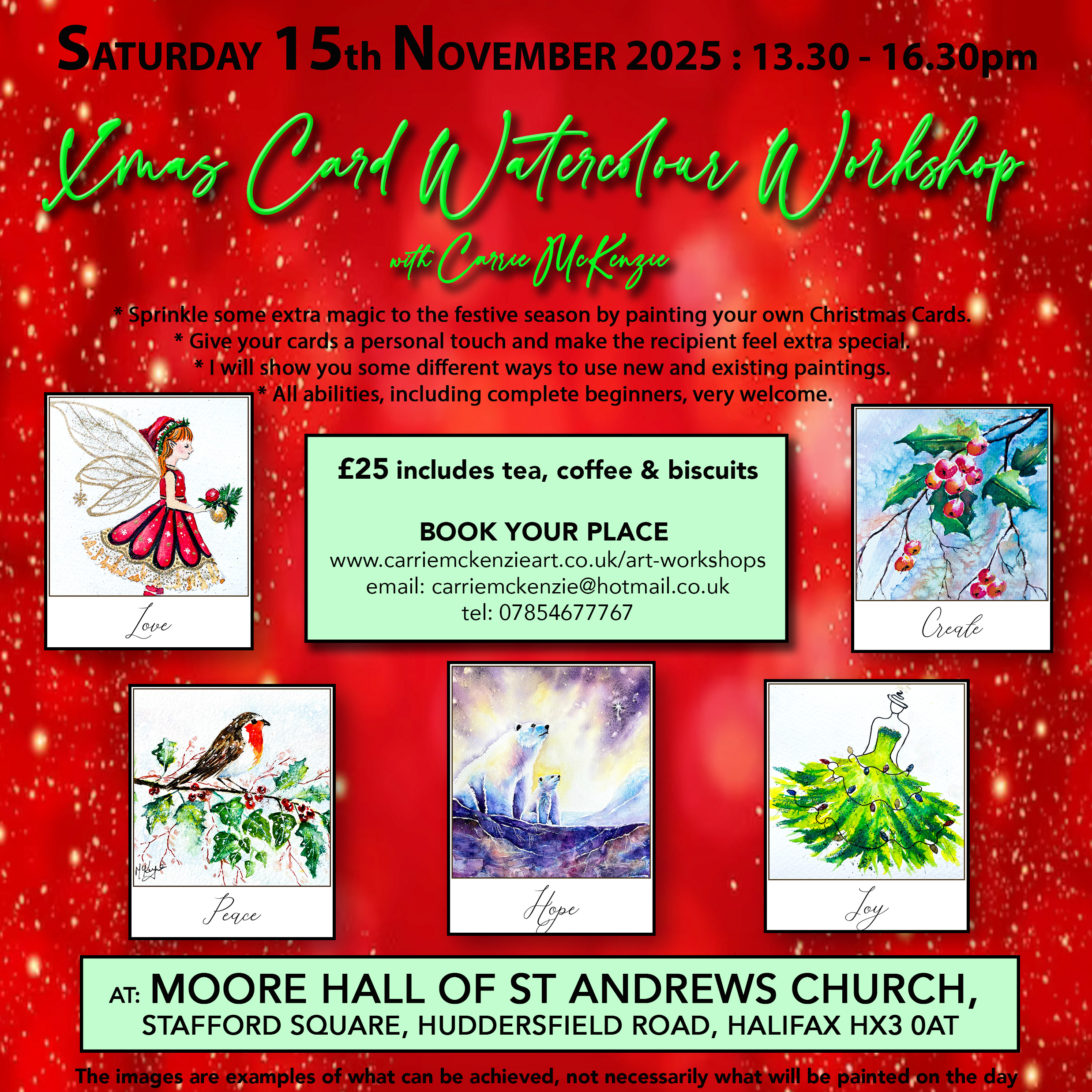 You can paint! Come along and enjoy my friendly and joyful art classes and workshops. Using the magical translucency of watercolour, I will demonstrate and guide you through a complete painting from start to finish, sharing all the tips and techniques needed step-by-step. I will break the subject down into easy to understand sections, and give you lots of practical guidance and support. I cater for all levels, from complete beginners who have never painted before to practiced artists who want to try out some new techniques – everyone is welcome. Painting is a wonderful way of stepping away from the hubbub of daily life – there is no right or wrong in art, so you can’t fail – there is only learning and growth. We will use colour to capture the mood and essence of our subject and our emotions, and enjoy the value of art for the ‘journey’, not just the end result. In addition to immersing yourself in a beautiful painting for a few hours, we always make time for tea and cake! All in a lovely, relaxed, happy atmosphere of creativity and friendliness. “The course has been brilliant, Carrie is an excellent teacher and made everyone feel welcome.” “Thoroughly enjoyed the art classes, learning how to do things I never believed I could! “Really helped my confidence and ability. I learnt lots of techniques, would love to attend more.” “Carrie was a great supportive teacher. The workshop was brilliant.”  I run a limited number of classes so be sure to book your place early. To receive advance information about forthcoming workshops, just send your email address to join my distribution list. ______________________________________________________________________________________ ART WORKSHOPS 2025 * Click on the ADD TO CART button to pay by Paypal, or by Bank Debit or Credit Card. * Please contact me if you prefer to pay by bank transfer or would like more information. * Images in flyers are examples of what can be achieved, rather than what will be painted on the day. * If you are a first-time beginner I can provide all materials needed for the session for an extra £5. Saturday 15th November 2025: 13:30-16:30 £25.00