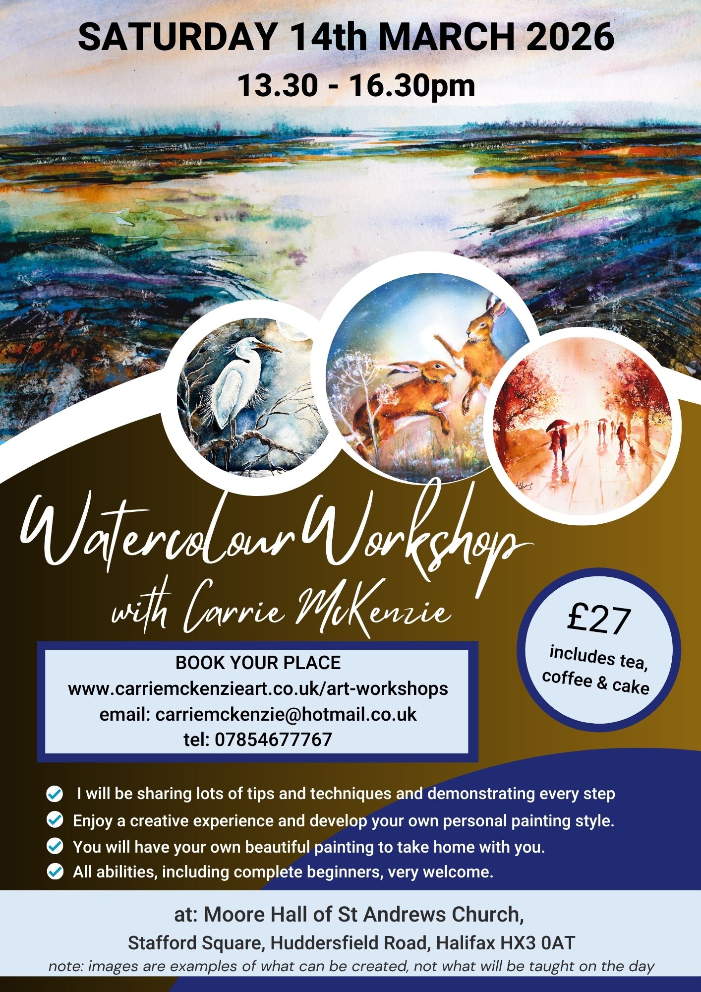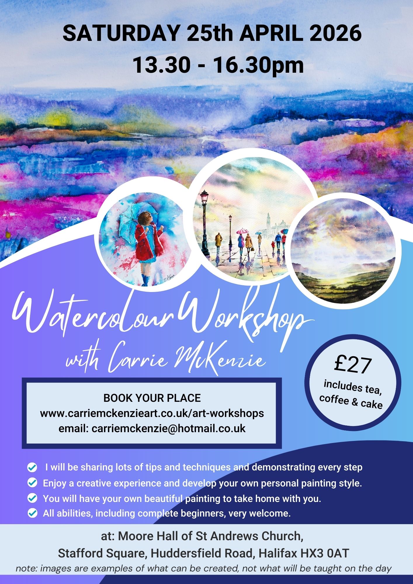 You can paint! Come along and enjoy my friendly and joyful art classes and workshops. Using the magical translucency of watercolour, I will demonstrate and guide you through a complete painting from start to finish, sharing all the tips and techniques needed step-by-step. I will break the subject down into easy to understand sections, and give you lots of practical guidance and support. I cater for all levels, from complete beginners who have never painted before to practiced artists who want to try out some new techniques – everyone is welcome. Painting is a wonderful way of stepping away from the hubbub of daily life – there is no right or wrong in art, so you can’t fail – there is only learning and growth. We will use colour to capture the mood and essence of our subject and our emotions, and enjoy the value of art for the ‘journey’, not just the end result. In addition to immersing yourself in a beautiful painting for a few hours, we always make time for tea and cake! All in a lovely, relaxed, happy atmosphere of creativity and friendliness. “The course has been brilliant, Carrie is an excellent teacher and made everyone feel welcome.” “Thoroughly enjoyed the art classes, learning how to do things I never believed I could! “Really helped my confidence and ability. I learnt lots of techniques, would love to attend more.” “Carrie was a great supportive teacher. The workshop was brilliant.”  I run a limited number of classes so be sure to book your place early. To receive advance information about forthcoming workshops, just send your email address to join my distribution list. ______________________________________________________________________________________ ART WORKSHOPS 2026 * Click on the ADD TO CART button to pay by Paypal, or by Bank Debit or Credit Card. * Please contact me if you prefer to pay by bank transfer or would like more information. * Images in flyers are examples of what can be achieved, rather than what will be painted on the day. * If you are a first-time beginner I can provide all materials needed for the session for an extra £5. Saturday 14th March 2026: 13:30-16:30 Please email me if you would like to be added to the waiting list Saturday 25th April 2026: 13:30-16:30 Please email me if you would like to be added to the waiting list Saturday 21st February 2026: 13:30-16:30 Please email me if you would like to be added to the waiting list Saturday 24th January 2026: 13:30-16:30 Please email me if you would like to be added to the waiting list ART SOCIETY DEMO-WORKSHOPS 2024 If your art club would like me to deliver a mini workshop/demo for your members, please get in touch through the Contact form here on my website ___________________________ ART TUITION BOOKS (see BOOKS tab for ordering) £27.00 ART TUITION FOR 2026 Â