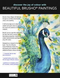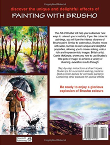 My step-by-step book is packed with exciting ideas and techniques. This inspiring book will help you to discover new ways to unleash your creativity. Filled with easy to follow step-by-step guides, it shows you how to use Brusho’s ‘little pots of magic’ for a variety of stunning, evocative paintings. If you like colourful paintings, then you will love the intense vibrancy of Brusho paint. Let me take you on a creative journey of start-to-finish demonstrations, exciting techniques, and special effects such as using Brusho with starch, soap, bleach, gesso, granulation medium, acrylic ink, etc. Similar to watercolour, Brusho mixes with water, but has its own unique and delightful properties, allowing you to create striking, colour rich and impressionistic images. As the chapters unfold, you will learn how Brusho colours work together, some simple composition strategies, and how to produce your own vibrant, colourful paintings by using Brusho in a range of adventurous ways. Also, each chapter includes several gallery paintings that capture the essence of every theme and provide extra inspiration for your own Brusho visions. The Art of Brusho is packed with: