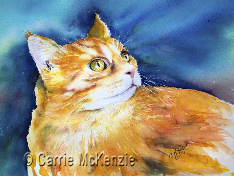 GINGER CAT PAINTING  t COPYRIGHT © Carrie McKenzie: Artist Halifax West Yorkshire. COLOUR MATCH: care has been taken to colour match the painting/print with what you see online, however colours on different viewing devices can vary due to individual screen settings. WATERMARK: The copyright watermark will not appear on the original painting or prints.