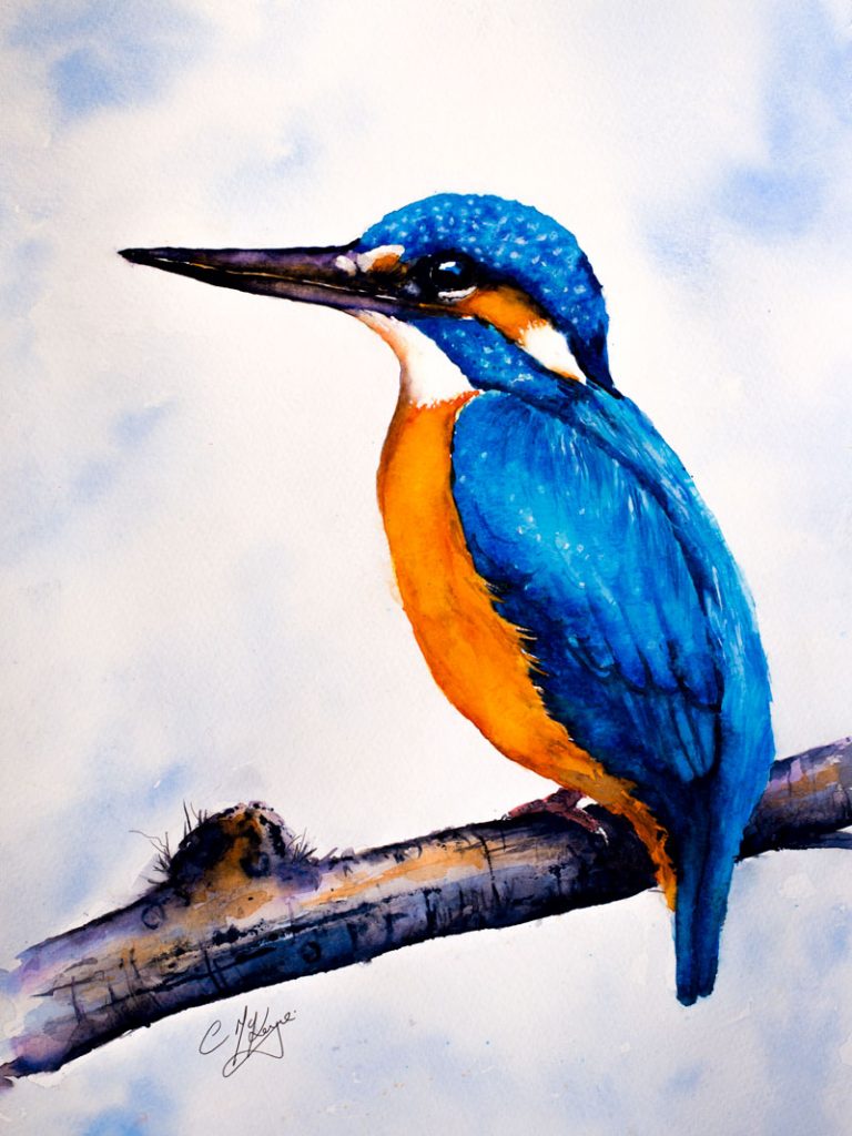 In this video I will show you how to paint a beautiful Kingfisher from start to finish. The video includes lots of tips and techniques as I demonstrate how to create different texture effects such as feathers, bark, sky. It includes principles of layering colours, softening and blending hard lines and shapes, reserving white paper, painting the bird’s eye, painting wet-in-wet etc.